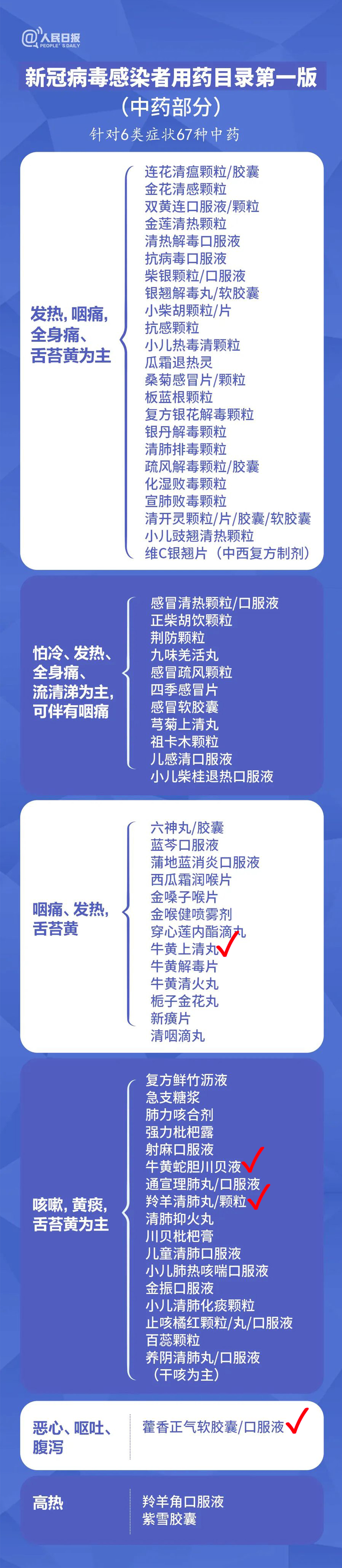 此版用藥目錄按照中西藥分開的原則,是對(duì)國家第九版診療方案中推薦用藥的完善和補(bǔ)充,針對(duì)發(fā)熱、咽痛等6類中醫(yī)診斷癥狀推薦67個(gè)中藥品種;針對(duì)咳嗽、咳痰等4類臨床癥狀推薦41個(gè)西藥品種。