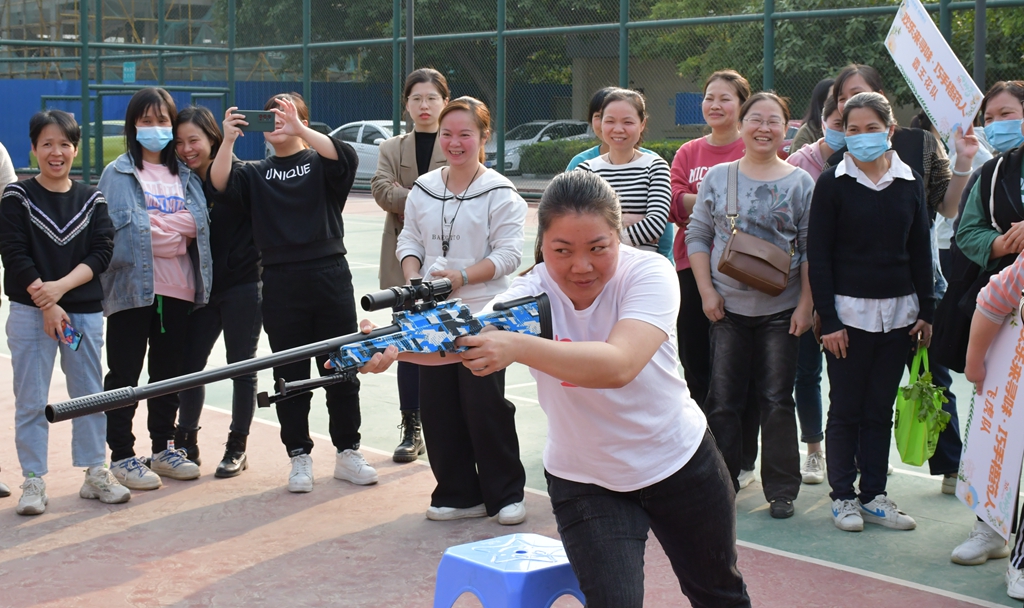 完成“尋寶”任務(wù)的女職工們,即可變身“巾幗槍手”。射擊點(diǎn)上“陀槍師姐”們手握氣槍?zhuān)Ω叨燃?,沉著冷靜?!把b彈、上膛、瞄準(zhǔn)、擊發(fā)”,各個(gè)環(huán)節(jié)操作嚴(yán)謹(jǐn),舉手投足間盡顯颯爽英姿,彰顯了女職工們無(wú)畏險(xiǎn)阻,奮楫前行的巾幗本色。當(dāng)“子彈”擊破氣球響亮的爆破聲在球場(chǎng)內(nèi)陣陣響起,現(xiàn)場(chǎng)笑聲、鼓掌聲此起彼伏。大家在射擊中瞬間放松了心情,緩解了工作壓力,同時(shí)為活動(dòng)增添了濃厚的節(jié)日氣氛。
