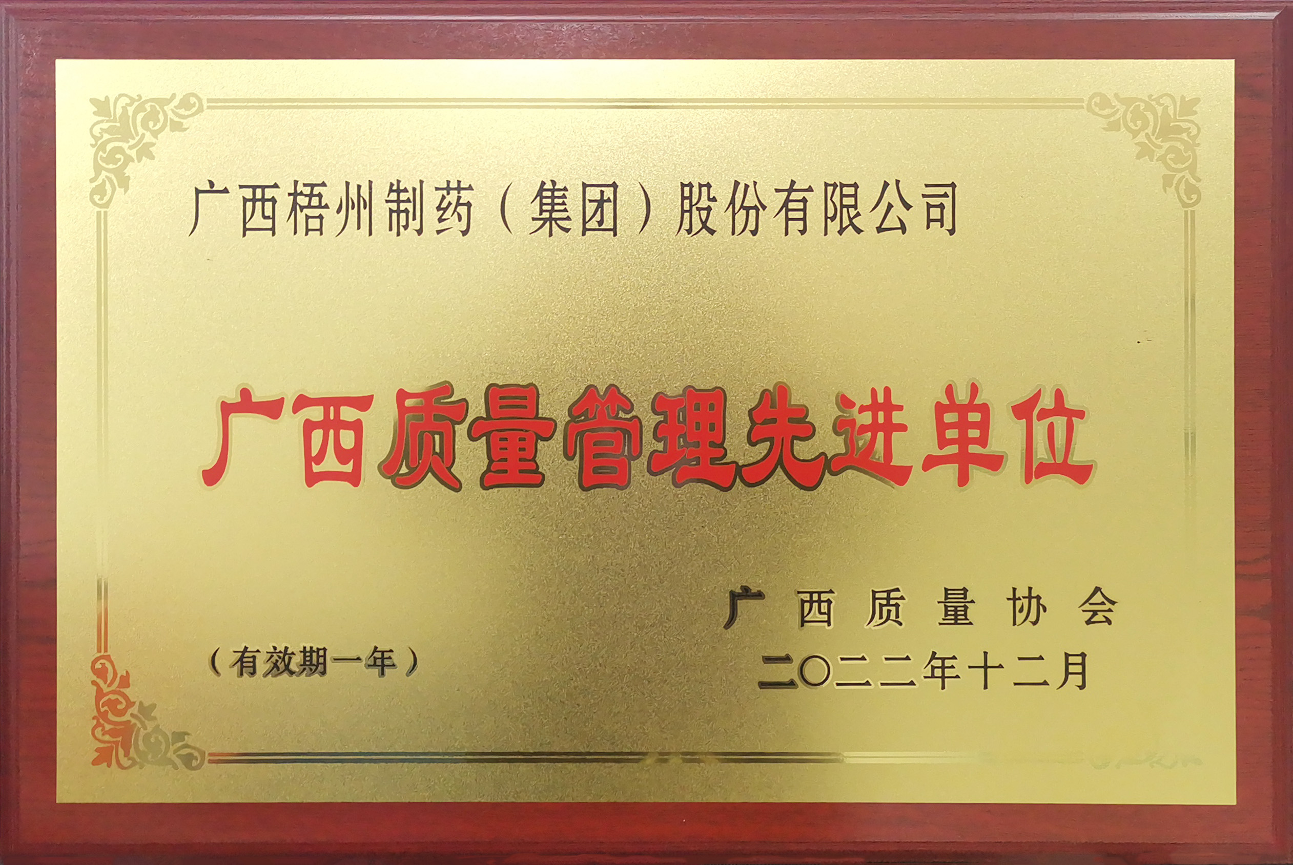 廣西梧州制藥(集團)股份有限公司榮獲2022年度廣西質量管理先進單位