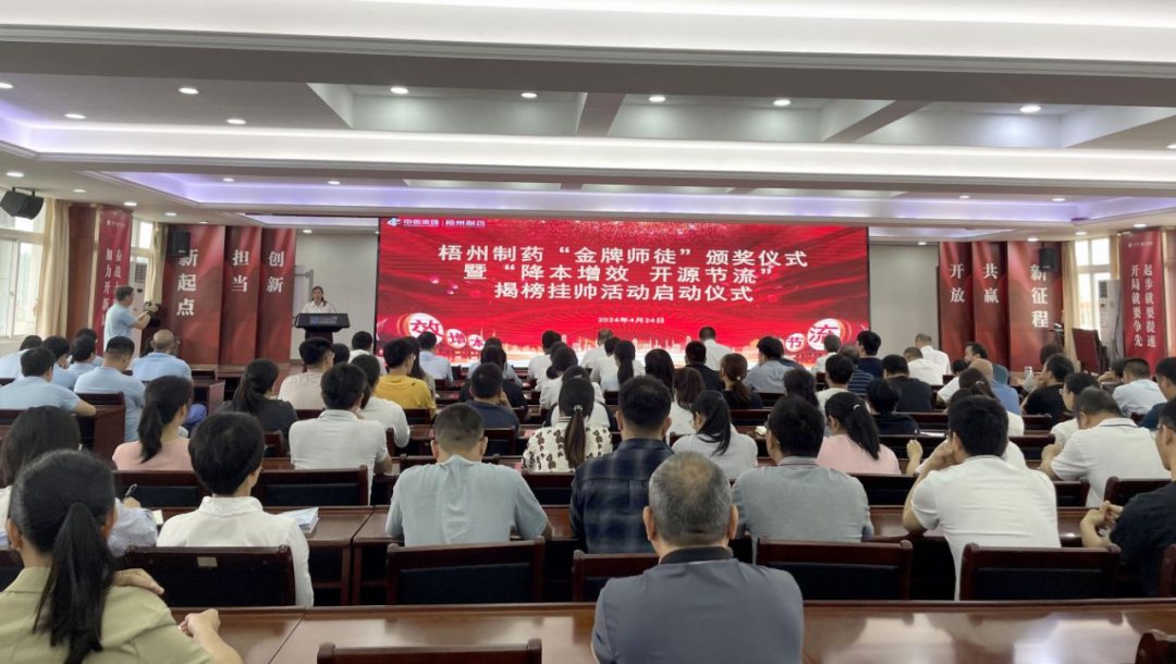 4月24日上午,一場(chǎng)感恩與奮進(jìn)的“金牌師徒”頒獎(jiǎng)儀式暨“降本增效 開源節(jié)流”揭榜掛帥活動(dòng)啟動(dòng)儀式隆重舉行。梧州制藥領(lǐng)導(dǎo)班子成員,各部門、各車間職工代表,及獲評(píng)星級(jí)的“金牌師徒”共150余人參加活動(dòng)。