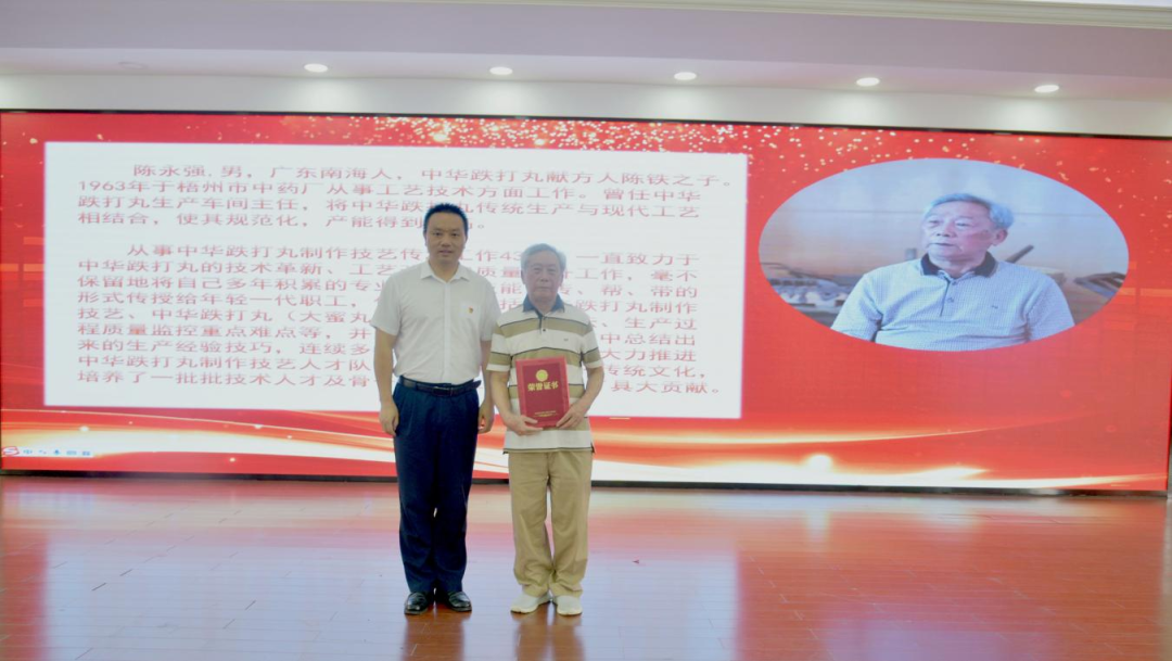 活動(dòng)還專門邀請(qǐng)了中華跌打丸獻(xiàn)方人陳鐵的兒子,現(xiàn)已83歲高齡的原跌打丸生產(chǎn)車間主任陳永強(qiáng)到會(huì),由公司黨委書記、董事長黃文彩為其頒發(fā)“中華跌打丸制作技藝——金牌師父”榮譽(yù)稱號(hào)?!爸腥A跌打丸制作技藝”的第三、第四、第五代非遺傳承人依次上臺(tái),同樣用傳統(tǒng)的束脩六禮對(duì)陳老進(jìn)行了謝師,以此來表達(dá)對(duì)師父的感激之情、教導(dǎo)之恩。