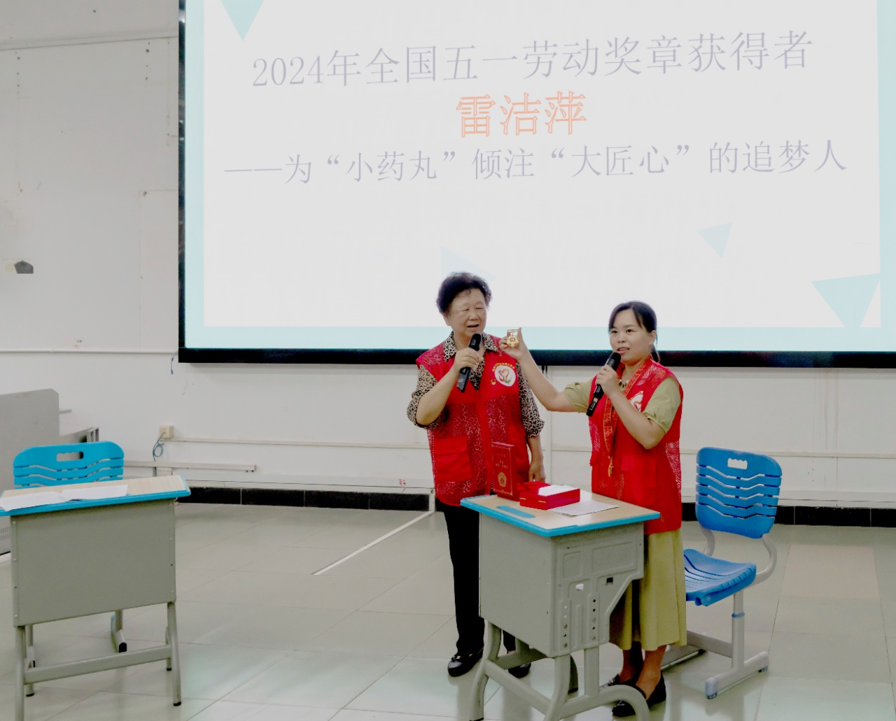 “同學(xué)們,這個是我們小雷師傅今年得到的全國五一勞動獎?wù)?,怎么樣?想要嗎?”老干部局的曾憲真主任拿起金燦燦的獎牌,展示給現(xiàn)場的同學(xué)們?!啊镔惱住?!看起來好有含金量”“雷姐姐太贊了,是我們學(xué)習(xí)的好榜樣”同學(xué)們的贊美崇拜之情溢于言表。