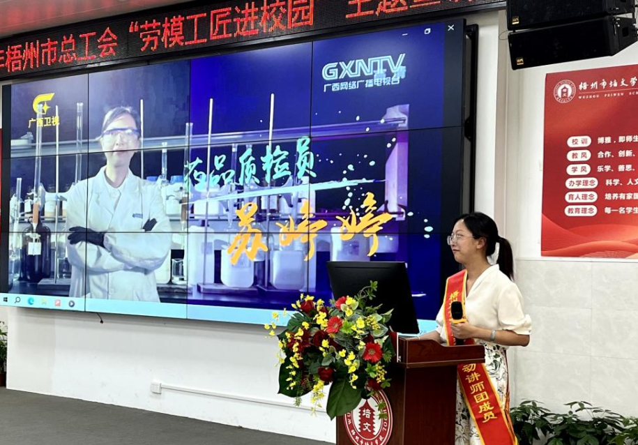 近日,梧州制藥質(zhì)量控制部主管蘇婷婷作為勞模代表走進(jìn)梧州市培文學(xué)校進(jìn)行2024“勞模工匠進(jìn)校園”主題宣講。