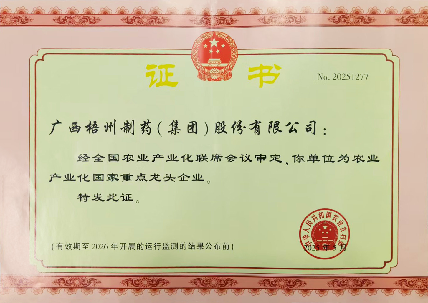 廣西梧州制藥(集團)股份有限公司獲評農業(yè)產業(yè)化國家重點龍頭企業(yè)